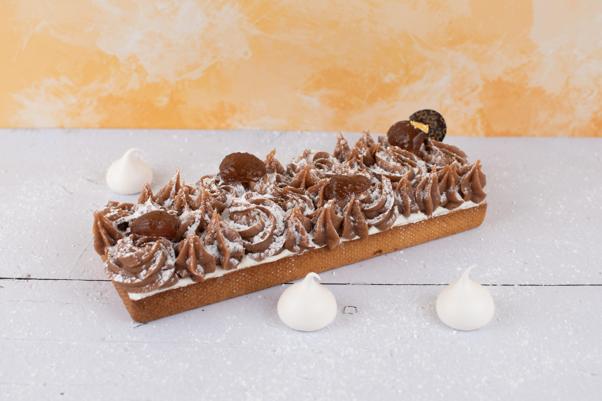 « Au pied du Mont Blanc, une pâte sablée croustillante s’élève tel un sentier vers les cimes, tapissée d’un confit de cassis aux éclats pourpres. La caresse d’une crème vanillée vient enlacer la profondeur des marrons, où scintillent quelques éclats confits, comme des cristaux de neige au soleil d’hiver. Chaque bouchée est une ascension douce, entre fraîcheur et chaleur, jusqu’au sommet de la gourmandise ».